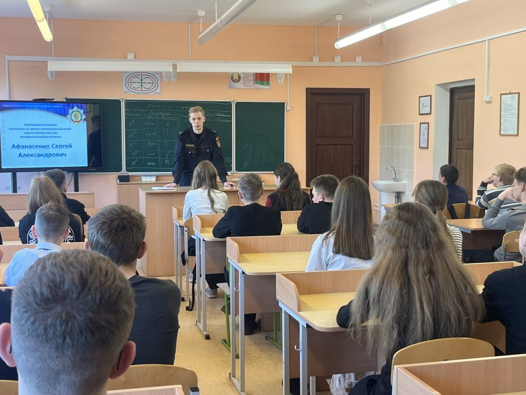 01.04.2026 с целью профилактики правонарушений и преступлений среди несовершеннолетних состоялась встреча учащихся 8-11 классов с участковым инспектором ИДН МОБ ОВД Жлобинского райисполкома С. А. Афанасенко. В разговоре с учащимися инспектор напомнил ребятам об ответственности по статье 328 Уголовного Кодекса Республики Беларусь (незаконный оборот наркотических средств, психотропных веществ, их прекурсоров и аналогов), побеседовал с учащимися по профилактике половой неприкосновенности, ответственности за курение в общественных местах. Особое внимание в беседе было уделено кибербезопасности, также Сергей Александрович ознакомил учащихся с Положением о конкурсе «#КиберПраво: твой щит в сети».